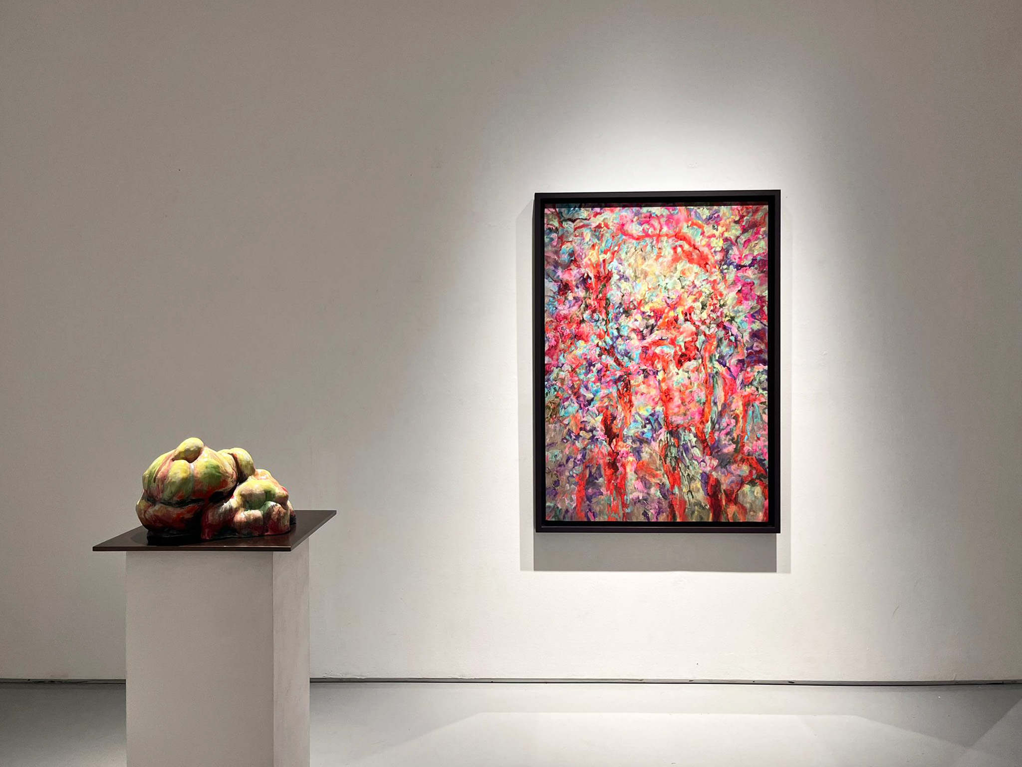 In Whispers of Summer Forests, Whee invites viewers into a contemplative realm where the heat and brilliance of summer dissolve into quiet murmurs of energy. Her paintings pulse with vibrant color and movement, evoking the unseen rhythm of life that continues to flow beneath the surface of nature — a whisper between the visible and the infinite.