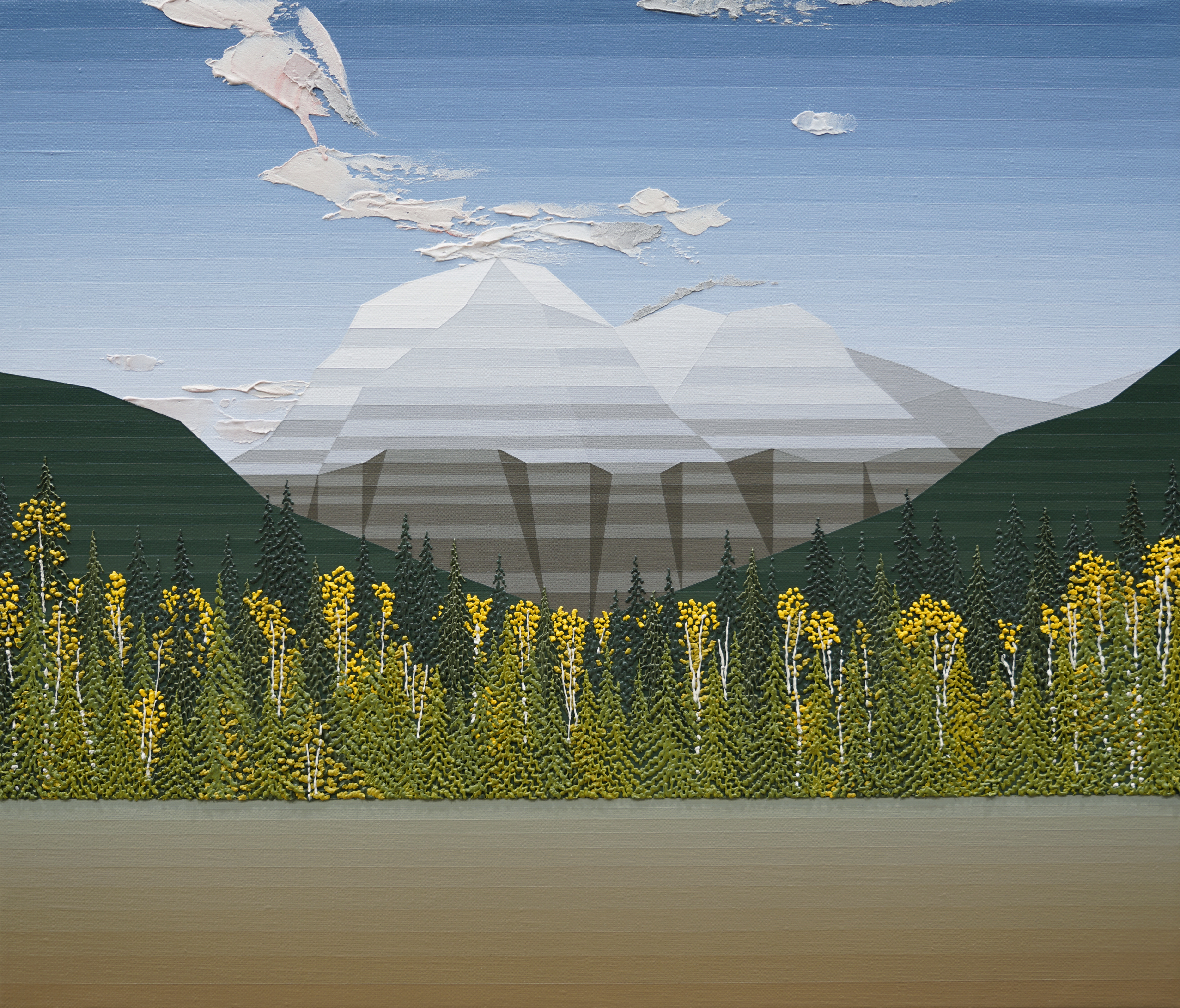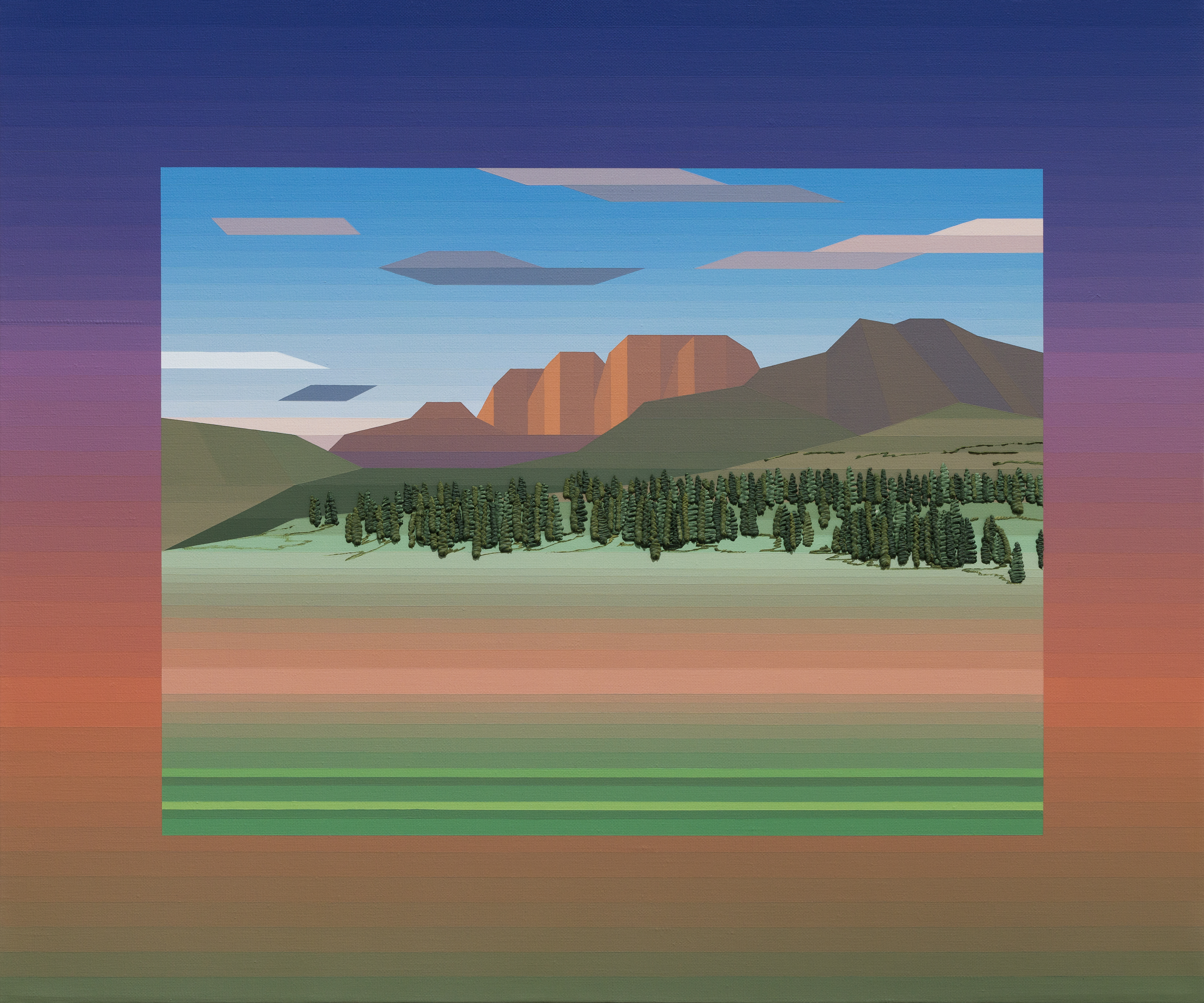 전영진의 작업에서 풍경은 자연을 재현하기 위한 대상이 아니라 회화의 구조와 본질을 드러내기 위한 장치로 등장한다. 화면 속 풍경은 색과 면의 기하학적 구성으로 단순화되며, 분할된 색면들은 마치 픽셀처럼 화면을 구성하며 절제된 회화적 구조를 형성한다. 이러한 단순화는 자연의 장면을 색과 면의 관계 속에서 다시 바라보게 하며, 관람자는 화면 속 풍경을 바라보는 동시에 회화 자체를 인식하게 된다.